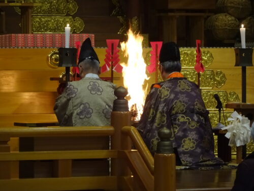 神事は祝詞奏上、祈願奉読、御神楽奉舞の後、護摩祈祷を厳修しました。