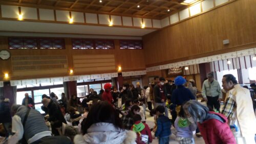 「福は内、鬼は外」の唱和の言葉が唱えられ、福豆と共に福菓子、落花生が振舞われた。